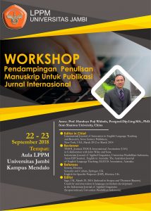 Diberitahukan kepada Bapak/Ibu dosen di lingkungan Universitas Jambi bahwa pendaftaran Workshop Penulisan Jurnal International yang dilaksanakan oleh Pusat Publikasi Ilmiah LPPM Universitas Jambi pada 22-23 September 2018 telah dibuka. Adapun syarat yang harus dipenuhi untuk workshop ini adalah: